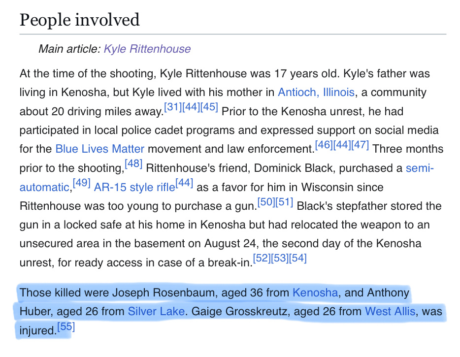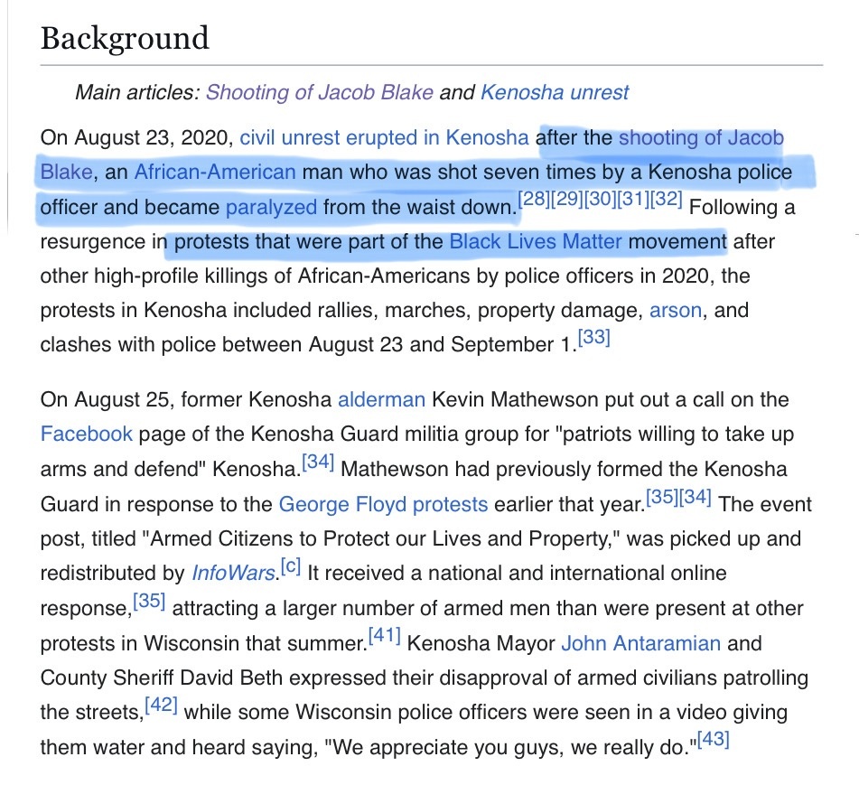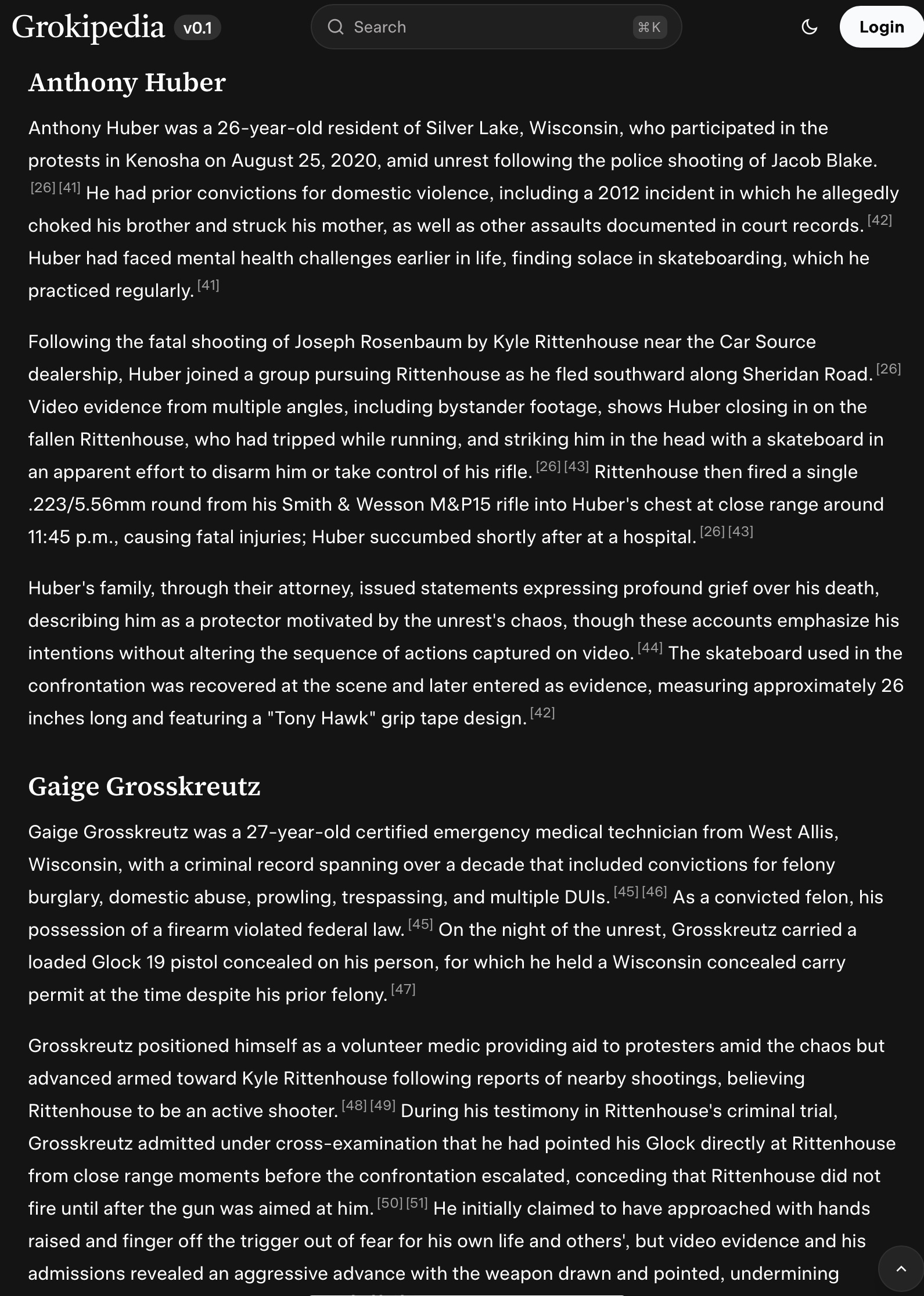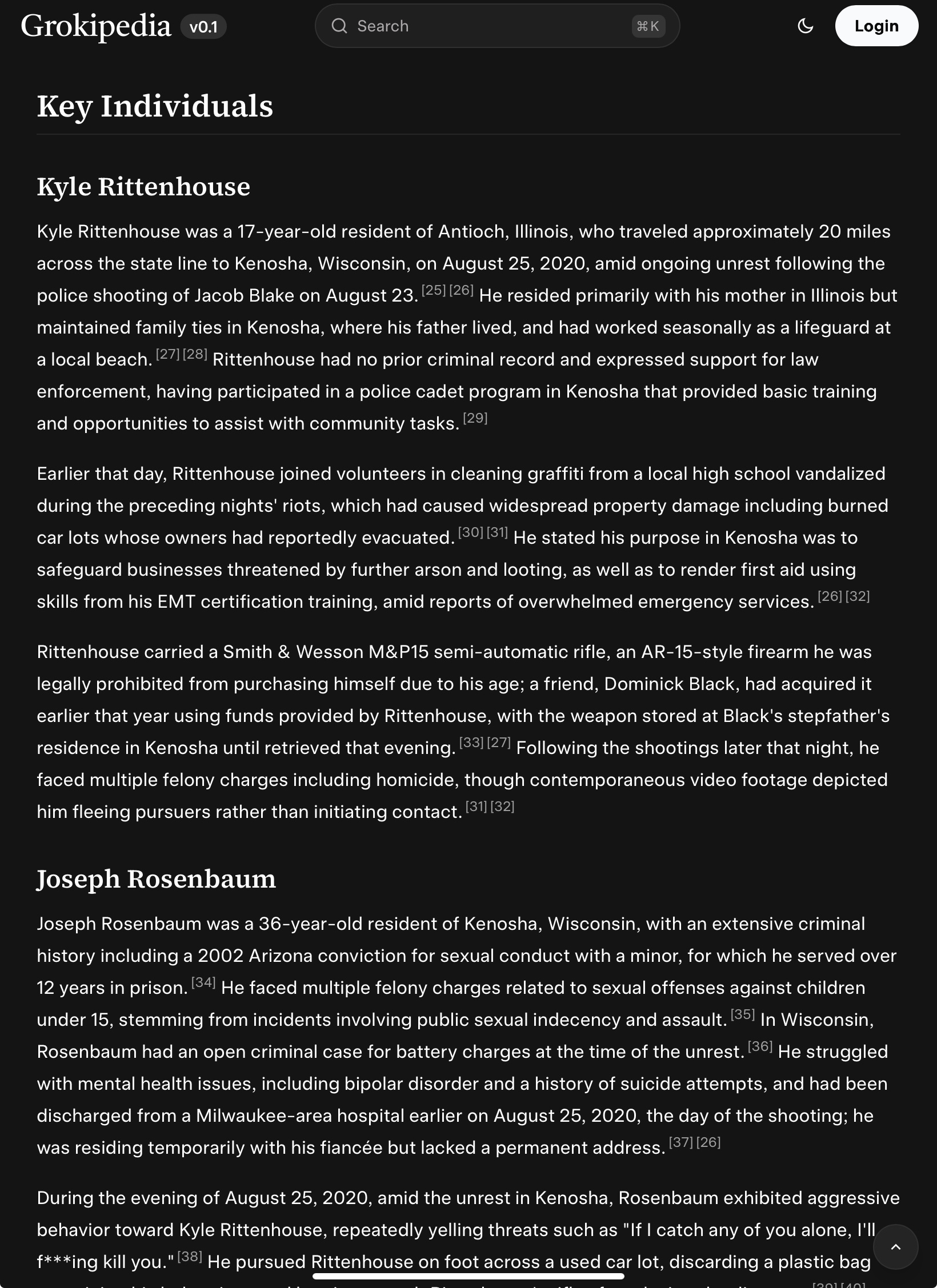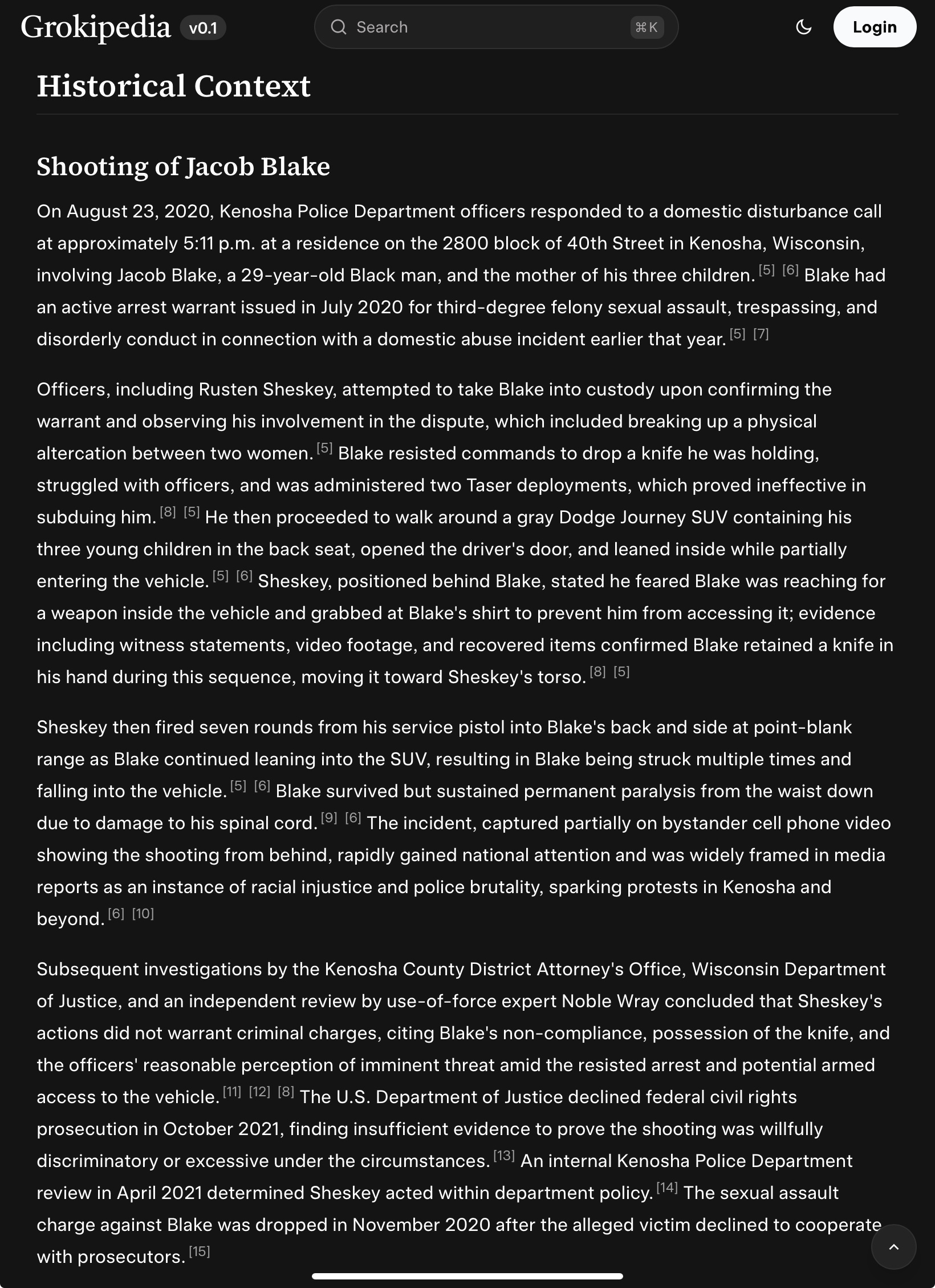 ▪️A key component to the shooting was understanding the broader context behind the Kenosha riots and who Kyle Rittenhouse ended up shooting. Wikipedia simply says that Jacob Blake was shot by police and was paralyzed, thus unrest. Grokipedia gives a much more in-depth account so the reader can see that Blake was a serial criminal with a warrant who had a knife and was resisting arrest while fleeing with children in his car.
